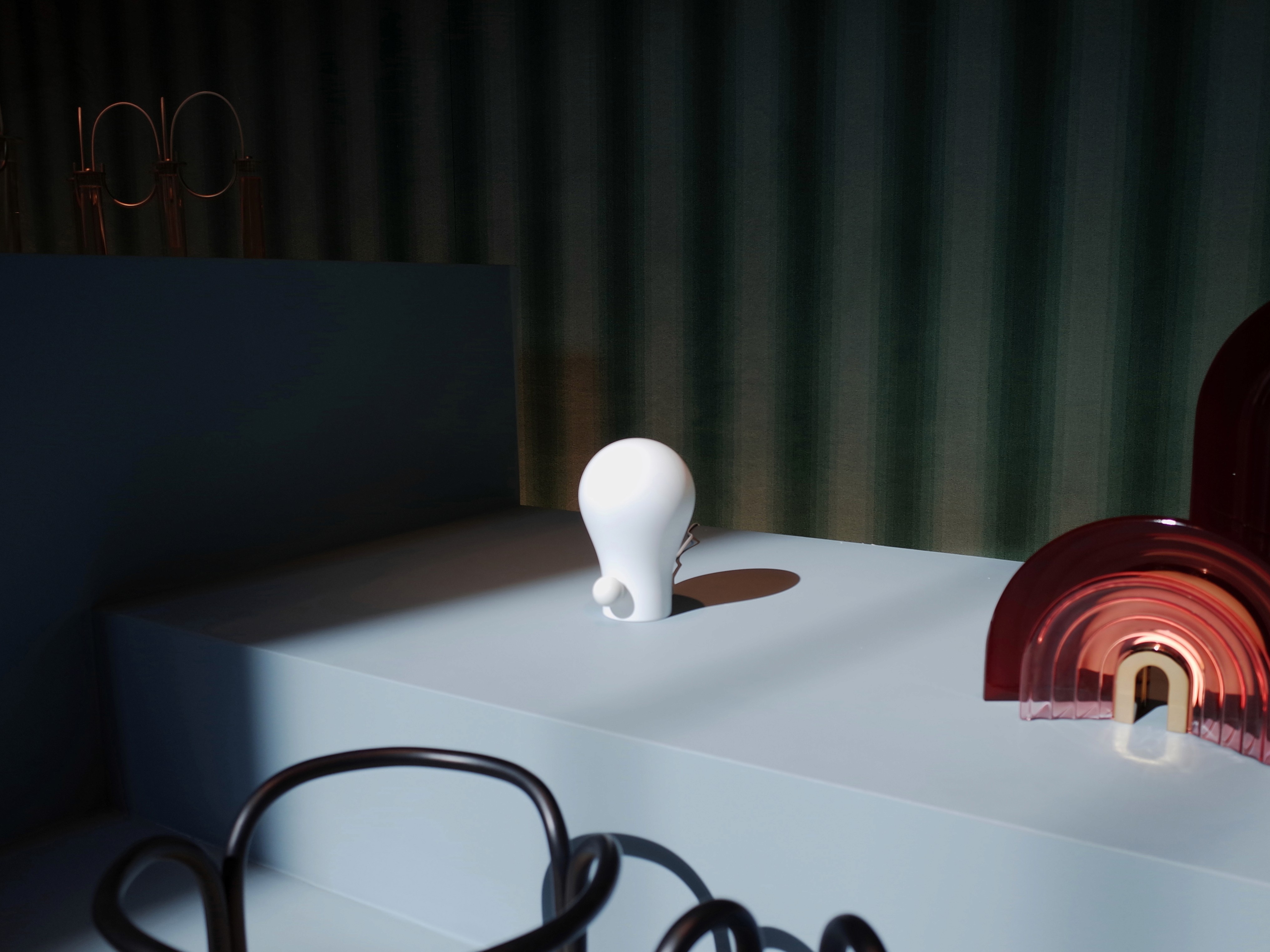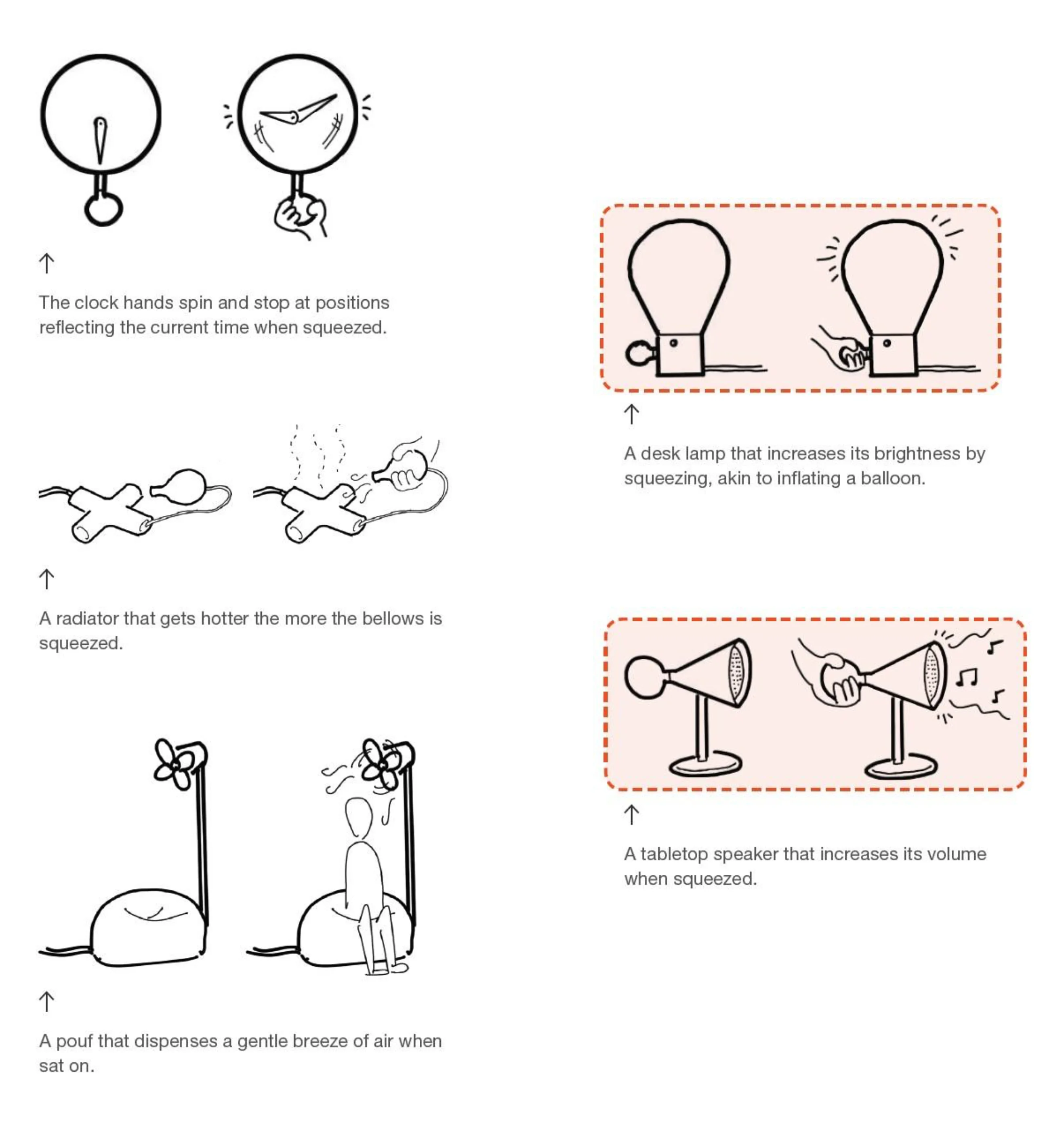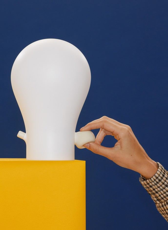 • Squeezy Lamp: The table lamp increases in brightness the more it is squeezed, and dims when a plug at the back is released. • Squeezy Speaker: With a similar gesture, the portable speaker increases its volume, and gradually quietens when it is set upright.